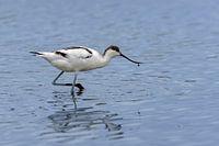Kluut (Recurvirostra avosetta) wadend door ondiep water in de Camargue in Frankrijk.