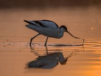 Deze foto van een fouragerende kluut is om 4:49 uur gemaakt, prachtig met dat oranje ochtendlicht!