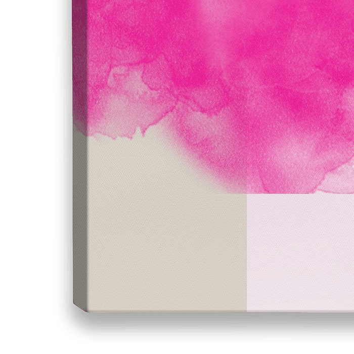 Knalroze neon aquarel "wolk" tegen een zacht roze achtergrond met kleurverloop. Daarachter een zandkleurige tweede achtergrond. Fris, verrassend en modern.