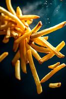 Knapperige frietjes zweven in de lucht, terwijl een vleugje stoom en mysterieuze verlichting een appetijtelijke sfeer creëren. De gouden kleur en perfecte textuur wekken de verwachting van een moment van genot. Ideaal voor in de keuken of eetkamer, waar ze de culinaire flair benadrukken en de smaakpapillen stimuleren.