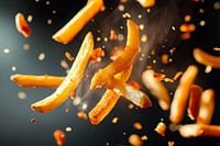 Knapperige frietjes die dansen in de lucht vangen het moment van perfecte versheid. Hun gouden kleur straalt warmte en plezier uit, terwijl kleine kruimels in de lucht zweven en de levendigheid van het tafereel benadrukken. Deze afbeelding is perfect voor in de keuken of eetkamer om eetlust en gezelligheid te stimuleren.