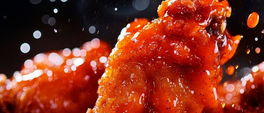 Een verleidelijk kleurenspel van fel oranje en knapperig goud dat letterlijk schreeuwt om verwennerij. De rondvliegende druppels pittige saus voegen dynamische energie toe aan de foto. Deze culinaire compositie is perfect voor de keuken, waar vrienden en familie samenkomen om te genieten van heerlijk eten.