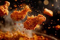 Koop de foto Knapperige stukjes kip in de lucht van Poster Art Shop op canvas, aluminium dibond, (ingelijste) fotoprint, behang en ArtFrame, op maat geprint in Fine-Art kwaliteit.