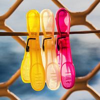Drie kleuren knijpers in het tegenlicht van de zon aan een waslijn op een balkon