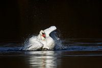 Een knobbelzwaan (Cygnus olor) poetst zich in het water op een meer in het natuurreservaat Mönchbruch bij Frankfurt, Duitsland.