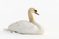 Een knobbelzwaan (Cygnus olor) in de sneeuw. De achtergrond is tevens wit door de sneeuw.