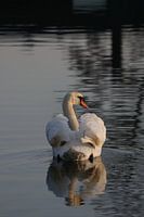 Knobbelzwaan zwemt in natuurgebied de Eijsder Beemden in de opkomende zon.