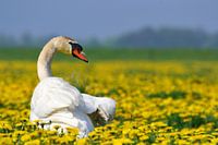 Elegante Knobbelzwaan rustend in een geel bloemenveld.