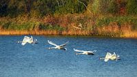 4 prachtige witte knobbelzwanen in vlucht met schitterende herfstkleuren op de achtergrond.