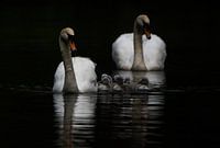 Een paartje knobbelzwanen met hun jongen dobberend over het water bij Landgoed Voorstonden.