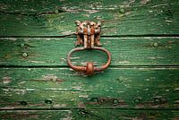 Dit is toch eigenlijk veel mooier dan een strak afgelakte deur. Een fraaie licht verroeste deurklopper en de verweerde verf zorgt voor zoveel karakter, ik hou hier wel van.