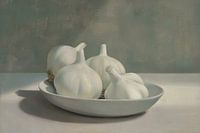 Knoflook | Silent Flavor Symphony - Dit stilleven schilderij toont enkele details uitgelichte knoflookbollen die rusten in een ondiepe kom, met een subtiel spel van licht en schaduw dat nadruk legt op de textuur van de knoflook en de gladde oppervlakte van de kom.