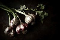 Een elegant en sfeervol stilleven waarin knoflookbollen met paarswitte schil subtiel worden uitgelicht tegen een donkere, roestige achtergrond. De ranke groene stelen buigen sierlijk over het beeldvlak, terwijl verse peterselieblaadjes en enkele losgekomen tenen het geheel afmaken. De compositie is harmonieus en ingetogen, en straalt een klassieke rust uit die doet denken aan de schilderkunst van de oude meesters. Dit werk is een ode aan eenvoud, smaak en natuurlijke schoonheid — perfect voor culinaire interieurs, rustieke keukens of liefhebbers van tijdloze voedselkunst.