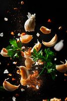 Koop de foto Knoflook en kruiden in vrije val van Poster Art Shop op canvas, aluminium dibond, (ingelijste) fotoprint, behang en ArtFrame, op maat geprint in Fine-Art kwaliteit.