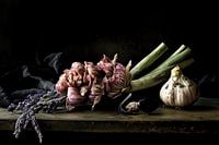 Een intrigerend stilleven waarin prei, knoflook en lavendel samensmelten tot een beeld vol textuur, kleur en mystiek. De preien zijn niet frisgroen, maar verwelkt en opengescheurd tot rozerode bloemachtige vormen — bijna surrealistisch. De paarse lavendel en zwartgerookte knoflookteentjes versterken het contrast tussen aardse ruwheid en verfijnde schoonheid. De donkere achtergrond en het tactiele linnen maken het beeld tot een klassieke compositie met een hedendaagse twist. Een kunstwerk dat zowel vergankelijkheid als vitaliteit viert.
