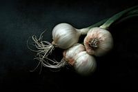 Een verstild, bijna sculpturaal stilleven waarin drie verse knoflookbollen centraal staan. De fijne, roze aders in de dunne schil, de kronkelende wortels en de fragiele loslatende lagen worden prachtig uitgelicht door klassiek clair-obscur licht. De donkere achtergrond creëert een tijdloze, intieme sfeer waarin de puurheid van het onderwerp volledig tot zijn recht komt. Een werk dat eenvoud en kracht combineert — perfect voor een keuken, eethoek of interieur met liefde voor ambacht en detail.