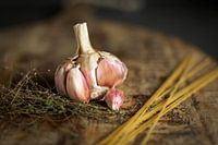 Knoflook, verse tijm & spaghetti op een houten snijplank