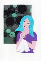 Dit is een collage van een meisje met blauw haar dat aan het naaien is. De achtergrond is een verzameling van knopen en munten. Het meisje tuit haar lippen en kijkt geconcentreerd naar het stuk stof dat ze in haar handen heeft.