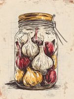 Een glazen pot gevuld met knoflooktenen, sfeervol getekend met warme okertinten. Deze illustratie ademt ambacht en Franse eenvoud — perfect voor een keukenmuur of delicatessenzaak.