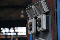 Knoppen en schakelaars voor de bediening van een kraan in een verlaten fabrieksgebouw van het niet meer in gebruik zijnde Reichsbahnausbesserugswerk RAW in het zuiden van Maagdenburg in Duitsland. Locomotieven en treinwagons werden tijdens de DDR bij RAW gerepareerd.