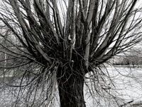 Een bewerkte foto van een knotwilg. De boom is in beeld met een deel van zijn stam en de takken. In de achtergrond is water te zien. Het beeld is zwart-wit gemaakt en is bewerkt met een filter om het beeld wat meer bijzonder te maken.