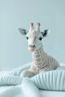 Een zachte giraffe van wol en garen. De babygiraffe ligt op een grof gebreid kleed van een lichte blauwe kleur. Schattig en klaar om te knuffelen. Het beeld is met behulp van ai gegenereerd.