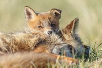 Een vossen welp die lekker bij moeders ligt en samen genieten van een zonnige dag . De kleine met een nog omgeklapt oortje is wel erg aandoenlijk