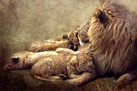 Trotse leeuw met een prachtige manen met zijn vier leeuwenbaby's die knuffelen