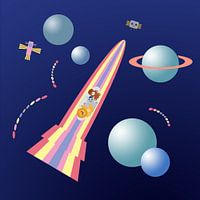 Kunst voor de kinderkamer. De knuffels maken spannende dingen mee. Deze keer gaan ze de ruimte in. Op zoek naar planeten misschien, maar het kan ook zijn dat ze eerst even op bezoek gaan op de maan. Aan de raket zal het niet liggen. De leeuw, de beer en het kleine nijlpaard hebben er zin in. Alleen het gemis van zwaartekracht is nog…