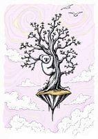 De afbeelding toont een koala die zich vastklampt aan een boom die op een drijvend eiland groeit. De boom is getekend in zwart-wit met kleine groene blaadjes. Het eiland heeft een gouden bovenkant en een rotsachtige, puntige onderkant. De achtergrond is een wervelende mix van roze en wit en lijkt op wolken en lucht. In de rechterbovenhoek vliegen twee witte vogels. De algehele sfeer is grillig en surrealistisch.