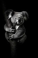 Een vriendelijke koala, comfortabel vastgeklampt aan een boom, schittert in zachte grijstinten. Zijn grote, nieuwsgierige ogen geven hem een charmante uitdrukking, terwijl de contrasten in de afbeelding een rustgevende sfeer creëren. Dit artistieke werk brengt een vleugje natuur in de woonkamer en nodigt uit tot ontspannende momenten.