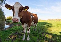 Deze foto van een koe is gemaakt in het weiland van Midden-Delfland. Koeien zijn nieuwsgierig en ze kwam toch even kijken. Deze close-up is met een groothoeklens gemaakt zodat de verhouding erg grappig wordt.