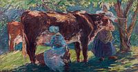 Een vrouw zit in haar blauwe jurk bij een koe en melk het rund. Bij de kop van het dier staat een andere meid in traditionele klederdracht en klompen.