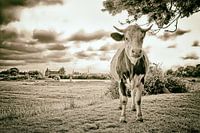 Een roodbonte Hollandse koe met op de achtergrond het Muiderslot. Vanaf de dijk van Muiden naar Muiderberg. Sepia versie.