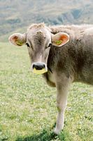 Foto van een koe met koebel en geel neus en oormerk in Andermatt, Zwitserland in de bergen