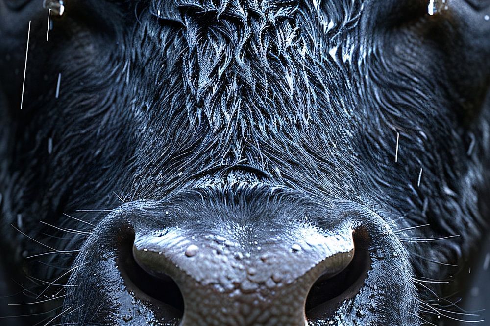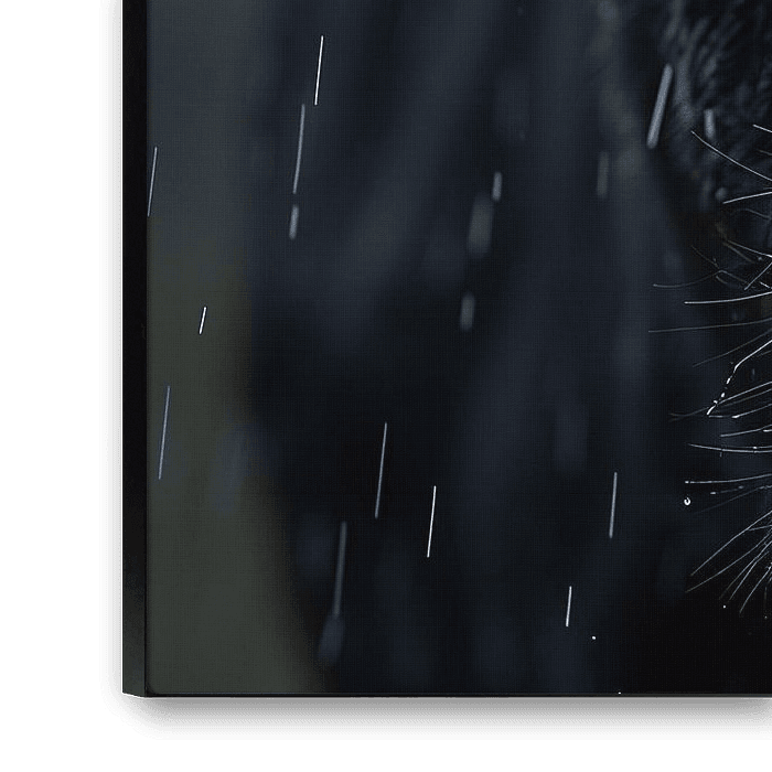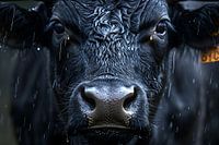 Deze verbluffend realistische afbeelding legt de intense blik en de natte vacht van een koe vast op een regenachtige dag. De gedetailleerde textuur van het natte haar en de reflecties in de ogen trekken de kijker in het moment. Het gebruik van een zwart-wit palet versterkt de dramatische en enigszins melancholische stemming van het tafereel, terwijl de subtiele details in de druppels en op de huid een gevoel van authenticiteit en aanwezigheid toevoegen. Ideaal voor een modern interieur dat natuurlijke elementen wil benadrukken met een artistieke flair.
