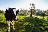 Een nieuwsgierige koe in de wei, met op de achtergrond hoogstamfruitbomen in de bloesem.