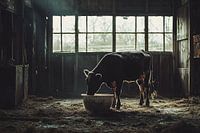 Deze afbeelding toont een eenzame koe die rustig in een oude, nostalgische schuur staat te eten. Het licht valt zacht door de ramen, waardoor de scène een serene en melancholische sfeer krijgt. De gedempte kleuren en het contrast tussen de donkere schaduwen en het natuurlijke licht geven de foto een rustieke en authentieke uitstraling. Perfect voor liefhebbers van het landelijke leven en een must-have voor een klassieke of boerderij-geïnspireerde inrichting. Deze foto past mooi in elke ruimte waar een vleugje rustieke charme gewenst is en brengt het kalme, eenvoudige leven op het platteland naar binnen.