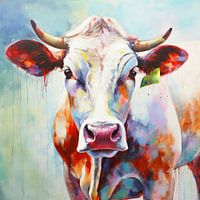 Een koe in een frontale pose kijkt de kijker direct aan - het gezicht is geschilderd in sterke, vloeiende kleuren die schommelen tussen realisme en abstractie. Rode en blauwe kleurstrepen geven het dier expressiviteit en energie, terwijl de pastelkleurige achtergrond een gevoel van rust en lichtheid creëert.