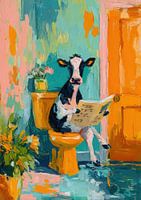 Dit olieverfschilderij toont een schattige koe die op een toilet zit en een krant leest. De badkamer is ingericht in pastelkleuren, met roze en blauwe muren, een gele deur, groene planten in potten en vintage meubilair. Zachte verlichting versterkt de vrolijke, levendige sfeer. Impressionistische penseelstreken en het getextureerde canvas creëren diepte en expressiviteit. De compositie combineert humoristische dierenillustratie, grillig interieurontwerp en decoratief kleurenschema en laat op charmante wijze de details van de meubels, planten en omgeving zien. De scène straalt warmte, speelsheid en een harmonieuze, gestileerde sfeer uit.