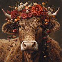 In dit betoverende portret staart een koe in de ziel van de kijker met een zachte, bijna menselijke uitdrukking. Het werk, versierd met een krans van weelderige herfstbloemen, combineert landelijke schoonheid met een vleugje poëzie. De warme bruine tinten van het vee harmoniëren perfect met de levendige kleuren van de bloemenkrans, waardoor het schilderij een levendige, opbeurende stemming krijgt. Dit schilderij is een eerbetoon aan de schoonheid van de landbouw en een perfecte aanvulling voor elk huis dat op zoek is naar een rustieke en toch elegante charme. Het spreekt vooral mensen aan die van het ongewone houden en de natuur in al haar facetten waarderen.