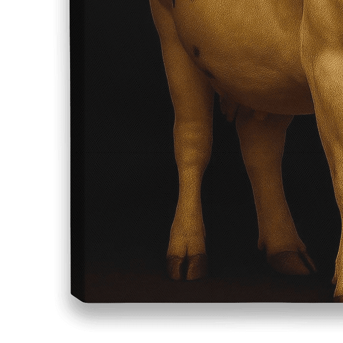 In dit warme en intieme portret zien we een melkkoe samen met haar nieuwsgierige kalf, tegen een diepzwarte achtergrond die het duo volledig in de spotlight zet. De moederkoe, met haar karakteristieke roodbonte vlekken en rustige uitstraling, straalt stabiliteit en zorgzaamheid uit. Het kalfje, nog klein en licht onwennig, kijkt vol…