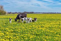 Koe met kalveren grazend in wei met paardenbloemen van Ben Schonewille