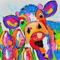 Koe met tulpen van de kunstenaars van Vrolijk Schilderij. Acrylverf op Canvas. Origineel 100 x 100