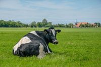 Een Friese stamboekkoe in een grazige weide in een landschap met een boerderij en een molen op het Zeeuwse eiland Walcheren.