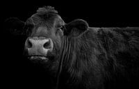 Close-up van een koe in zwart-wit.