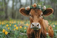 Dit charmante portret vangt de speelse essentie van een koe versierd met een delicate bloemenkrans. Omringd door een levendige bloemenweide kijkt het dier met nieuwsgierige ogen de wereld in. Elk detail, van de zachte bruine tinten van de vacht tot de pastelkleurige bloemen, is zorgvuldig vastgelegd om een sfeer van vredige harmonie te creëren. Perfect voor iedereen die van het plattelandsleven houdt en een stukje van deze rust naar zijn eigen vier muren wil halen. Het kunstwerk is een liefdesverklaring aan de schoonheid van plattelandsdieren en de eenvoud van leven in harmonie met de natuur.