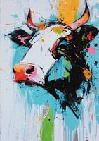 Koe - Dit abstracte schilderij toont een expressief portret van een koe, benadrukt door levendige, dikke verfstreken en spatten van oranje, blauw, groen en zwart, wat een energiek en moderne uitstraling creëert.