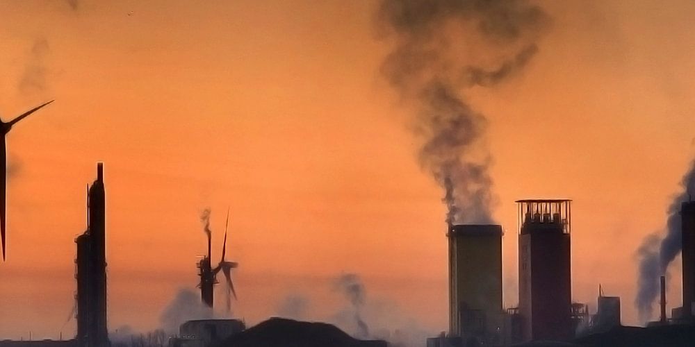 Yara, voorheen Hydro Agri en NSM in de Koegorspolder nabij Sluiskil en Terneuzen. Silhouet door zonsopkomst, en grondmist.