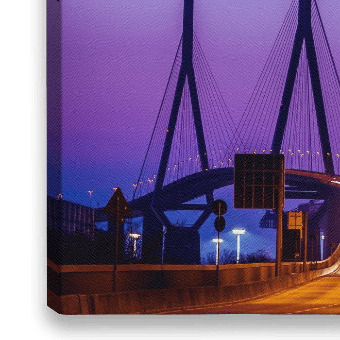 Bewegende auto's op de Köhlbrandbrug in het avondlicht